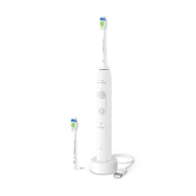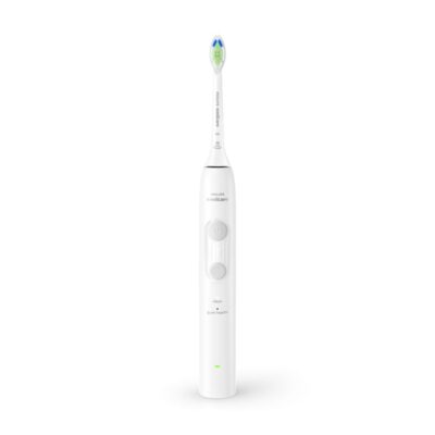 Philips Sonicare 4100 -sähköhammasharja auttaa pitämään hampaasi ja ikenesi puhtaina ja terveinä joka päivä – helposti ja kätevästi. Sonicare Fluid Action -teknologian ja jopa 31 000 harjausvedon minuutissa ansiosta se poistaa hellävaraisesti jopa 5 kertaa enemmän plakkia* ja puhdistaa tehokkaasti jopa vaikeasti tavoitettavat alueet. Mukana tuleva W-muotoinen harjaspää, kolme tehotasoa, SmartTimer ja Quadpacer tekevät harjaamisesta helppoa ja rutiininomaista. Paineanturi ilmoittaa, jos harjaat liian kovaa, mikä auttaa suojaamaan ikeniäsi, ja Easy Start -ohjelma sopii täydellisesti sähköhammasharjan käytön aloittelijoille.